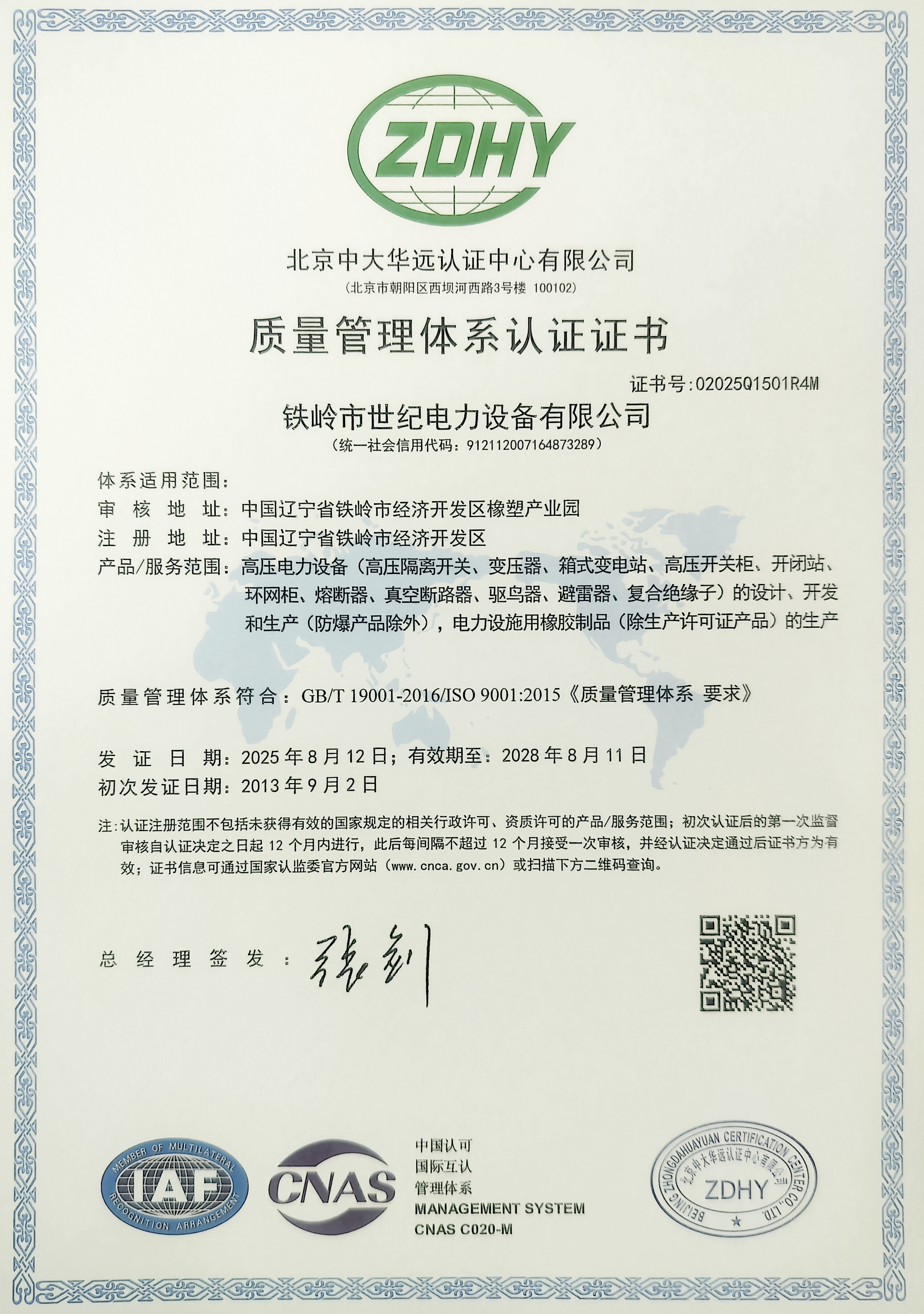 鐵嶺市世紀(jì)電力設(shè)備有限公司是集科研開發(fā)、生產(chǎn)制造、用戶服務(wù)于一體的國家高新技術(shù)企業(yè),始建于1999年,位于鐵嶺經(jīng)濟開發(fā)區(qū),占地面積5萬余平方米,建筑面積2萬余平方米。主要從事國家電網(wǎng)配套戶外高低壓隔離開關(guān)、電力電纜、變壓器成套裝置、高低壓開關(guān)柜、箱式變電站、絕緣子等產(chǎn)品的研發(fā)、生產(chǎn)和銷售。公司現(xiàn)有國家發(fā)明專利6項、實用新型專利9項,公司通過了ISO9001國際質(zhì)量管理體系認證、ISO14001環(huán)境管理體系認證和ISO 45001職業(yè)健康安全體系認證。